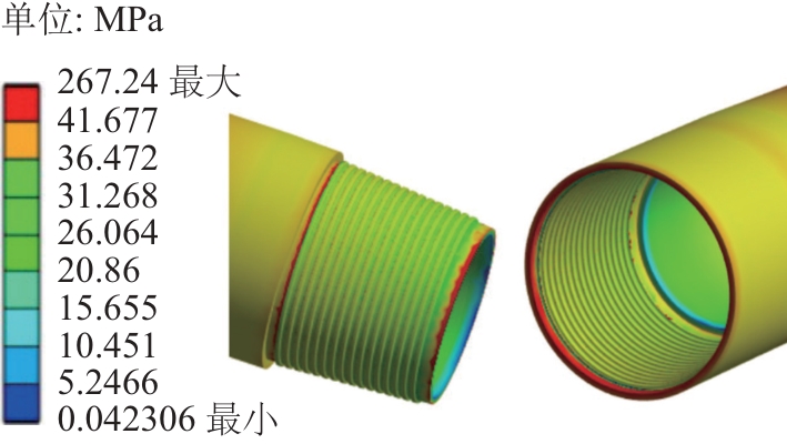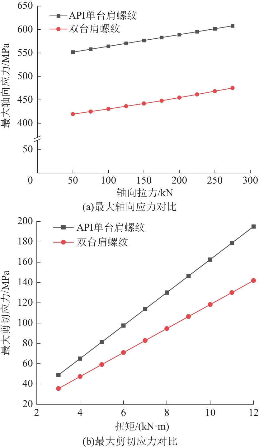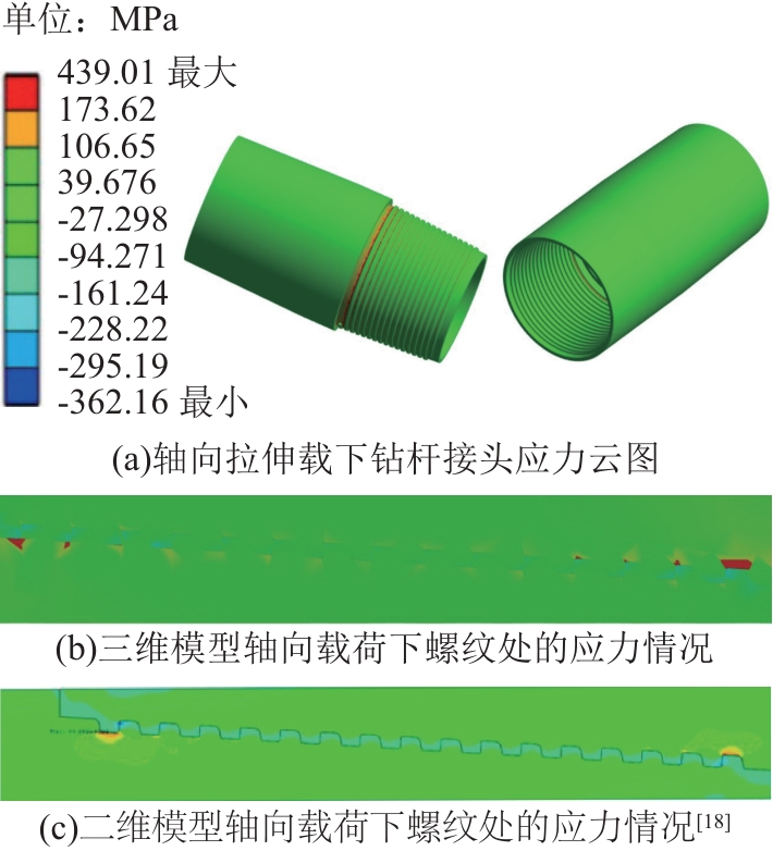 摘要:钻井工程中,钻杆接头螺纹连接处失效占比高达86%,是钻柱失效的主要风险部位。为深入分析接头应力分布及集中特性,本研究基于三维有限元仿真,对API标准单台肩与双台肩钻杆接头在轴向和扭转载荷下的应力进行了对比分析,并针对NC50型接头计算了轴向与扭转应力集中系数。研究发现:单台肩螺纹最大应力集中于螺纹啮合部第一圈齿根处;双台肩螺纹的最大轴向应力和剪切应力显著低于单台肩螺纹(分别约24%和27.3%),尤其在高扭矩下性能优势更明显;NC50接头的轴向应力集中系数为4.21,扭转应力集中系数为3.73。本研究成果为钻杆接头性能优化设计、钻井系统应力精确计算及疲劳寿命预测提供了重要依据。
